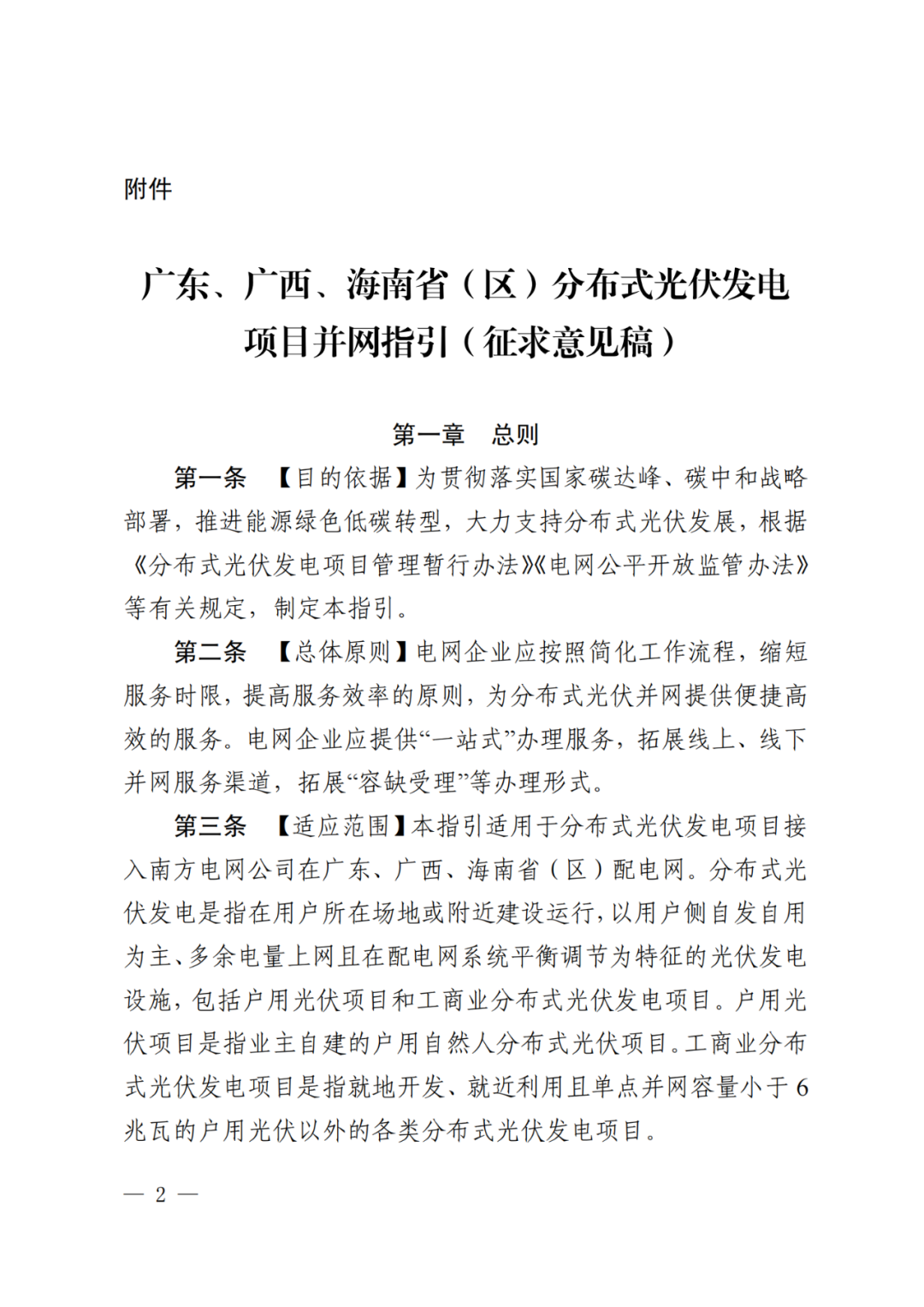 近期,国家能源局南方监管局印发了关于公开征求《广东、广西、海南省(区)分布式光伏发电项目并网指引(征求意见稿)》意见的通告。意见稿中对接入南方电网公司广东、广西、海南省(区)配电网的分布式光伏发电项目进行了并网指引。